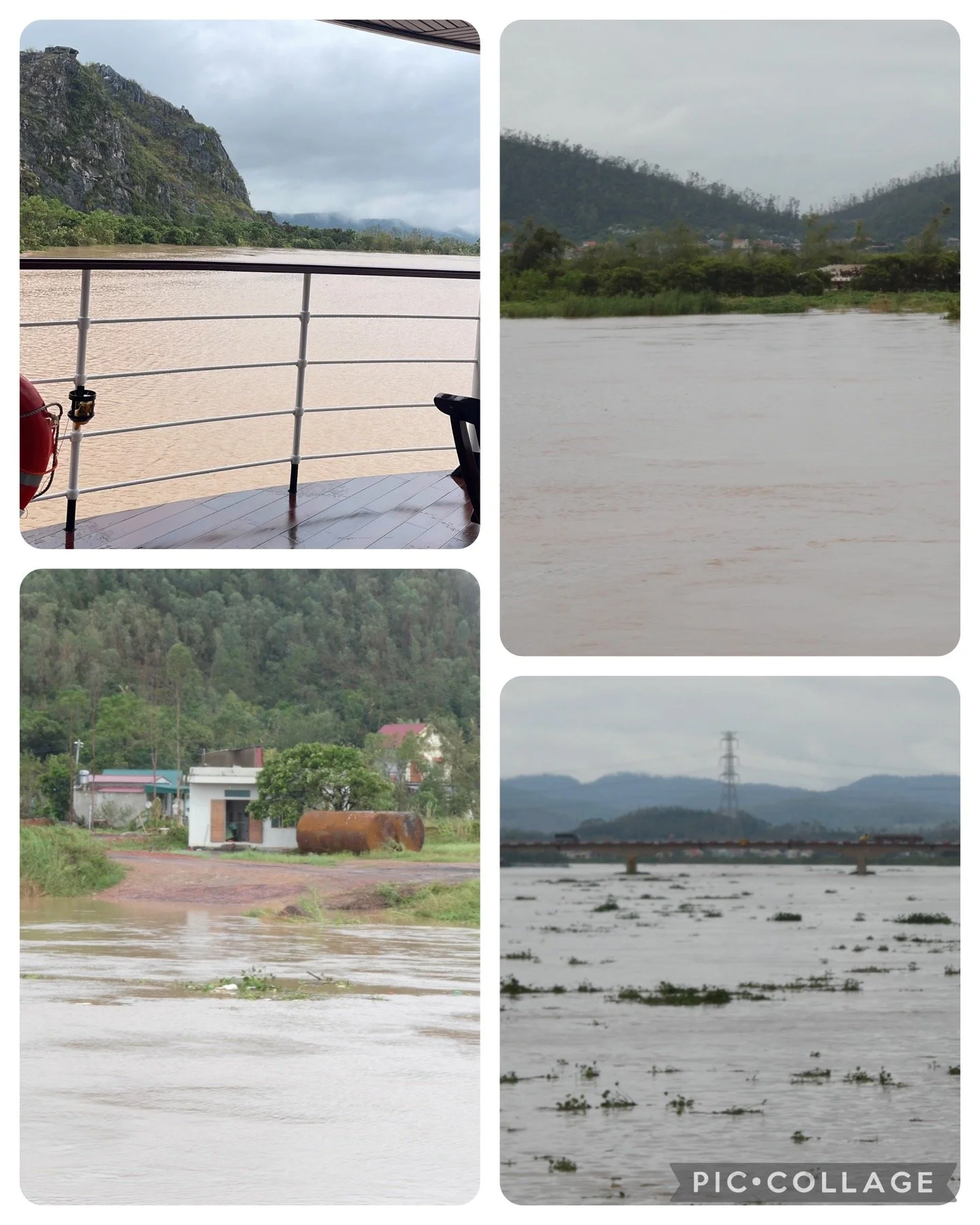 The pictures show how the river was flowing fast and so much debris….the bottom right photo with the bridge in the distance was to be the down fall of the journey . Pandaw Ankor needed 7.1 metres to clear the captain and engineer went to investigate and found there was only 4.1 metres. We were told we would disembark once they could determine where we could get off and they find transport and where we could go also most of the crew would also leave. So we all ate lunch not sure if we would return the government had also instructed Pandaw to get the passengers off. Not much dinner conversation just disbelief.