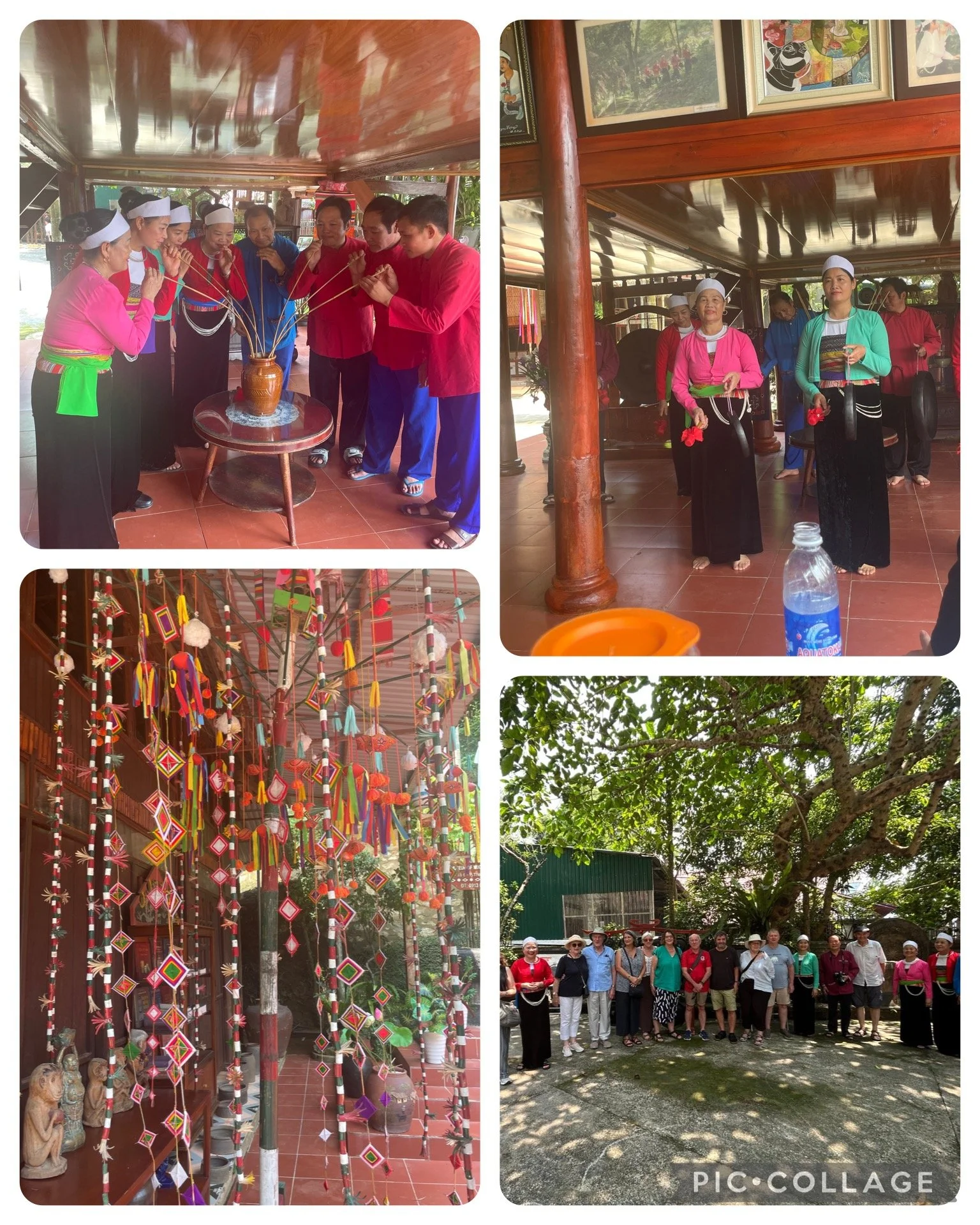 Today we drove south to Hanoi stopping on the way at Hoa Binh to a museum dedicated to the Moung people. This was interesting to see a group of people following their traditional ways in a city that was very different. They have built a museum for items they have collected from remote areas and displaying them in traditional houses that are now surrounded by other cultures in the photo the pot everyone drinking out of bamboo straws to welcome you to the village is rice wine