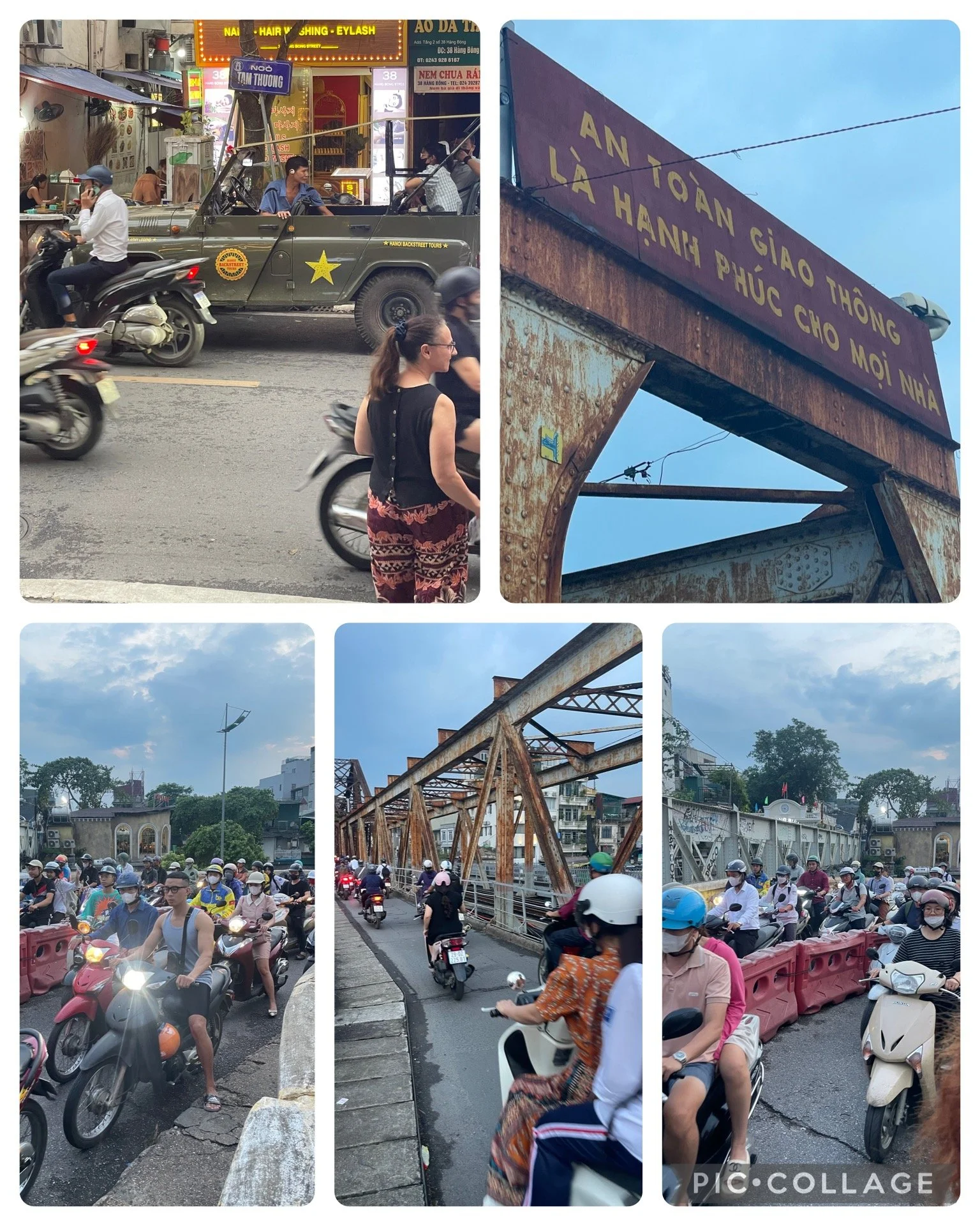 The first photo is the jeep we were in. The other is a bridge built by the French the in the 1930 during the war the Americans tried to bomb it 14 times without success there is a train line I. The middle. This was peak hour traffic Friday night